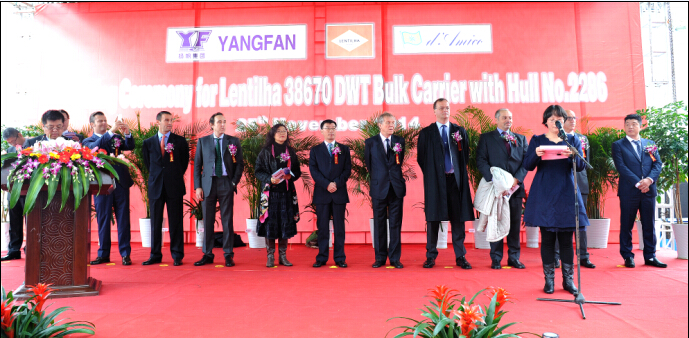 11月25日,由舟山船廠為Lentilha公司建造的38670DWT散貨船H2286舉行隆重的命名儀式。Dora投資有限公司董事長Patrice de Carmaret先生、教母張麗佳女士、揚帆集團董事長、總裁李明東等出席命名儀式。